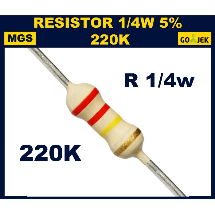 Resistor 220.000 Ohm atau 220k Ohm, batas daya 1/4 watt atau 1/2 watt, kebutuhan minimal 4 buah, perkiraan harga Rp. 100 - 250.
