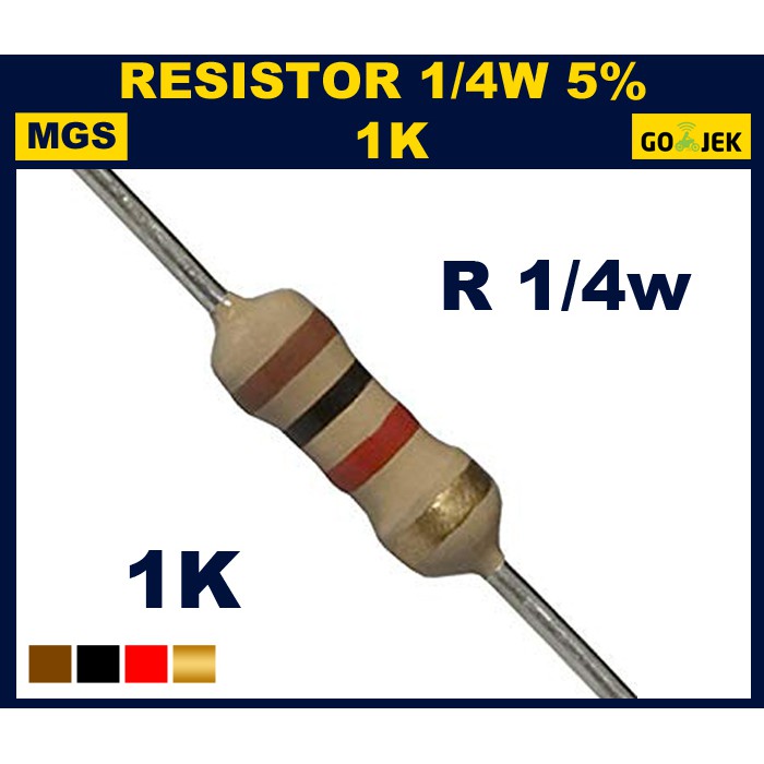 Resistor 1.000 Ohm atau 1k Ohm, batas daya 1/4 watt atau 1/2 watt, kebutuhan minimal 4 buah, perkiraan harga Rp. 100 - 250.